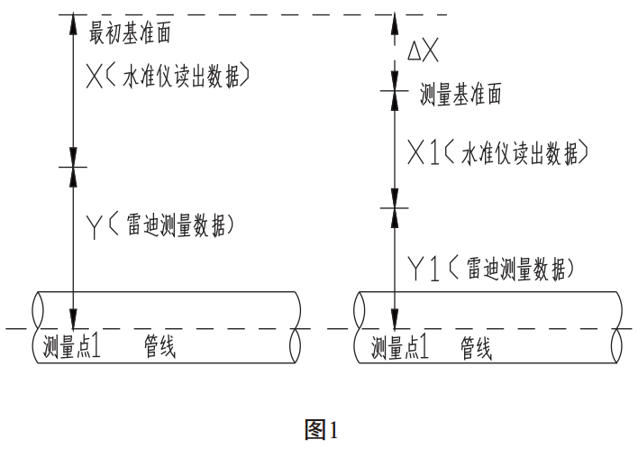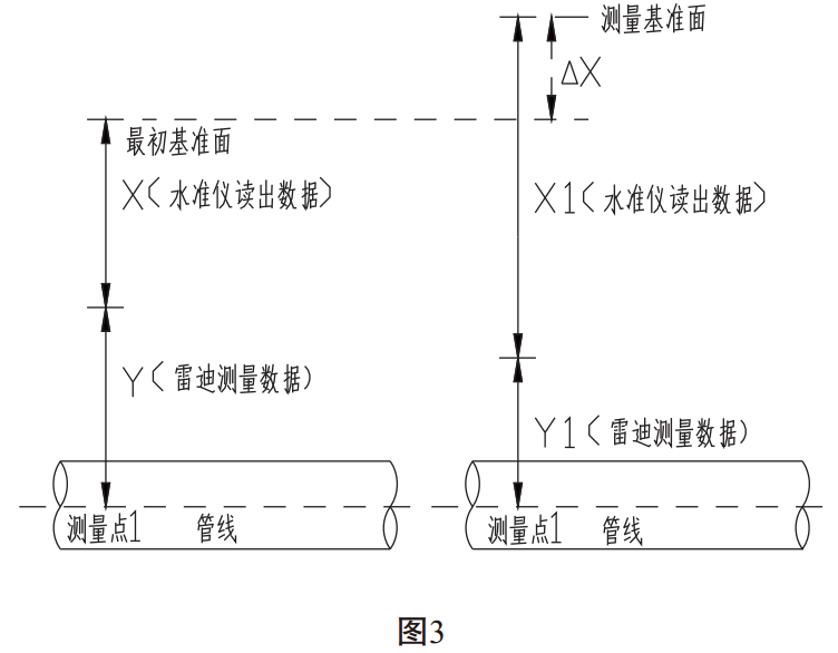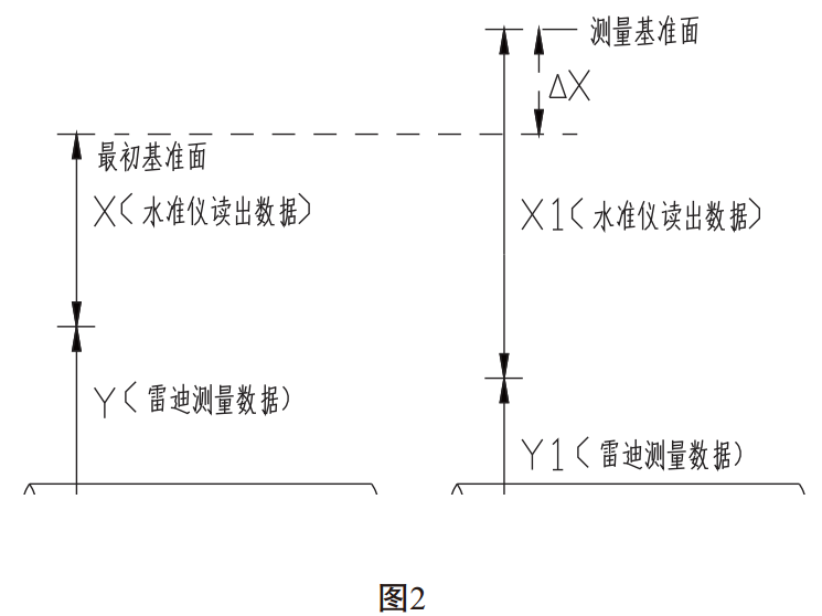 (1)同一測(cè)量點(diǎn)進(jìn)行下次測(cè)量時(shí),如果所選擇測(cè)量基準(zhǔn)面較最初基準(zhǔn)面低,△X為基準(zhǔn)面的差值,通過(guò)現(xiàn)場(chǎng)實(shí)際測(cè)量確定。如圖2: