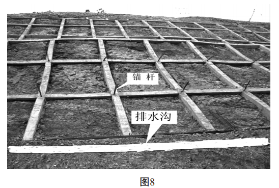 根據(jù)現(xiàn)場(chǎng)勘查的土層性質(zhì), 為了防止坡面的進(jìn)一步滑移, 需設(shè)置混凝土方格網(wǎng)植被護(hù)坡(見圖 8、 圖 9)