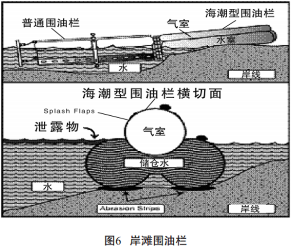 3. 岸灘圍油欄是一種特殊圍油欄, 它的干舷是充氣式的。 它的欄裙由兩個可充水的密閉水室組成, 使用時需要給水室充水。 岸灘圍油欄主要用于有潮汐的水域, 避免溢油在潮起潮落的轉換中逃逸。 岸灘圍油欄充水后重量大, 難以移動,一般可和普通圍油欄連接在一起使用。 落潮能裸露的區(qū)域使用岸灘圍油欄, 其余區(qū)域使用普通圍油欄, 見圖6。