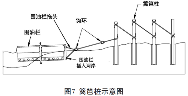 大的巖石、 樹或者人造的建筑(橋墩) 是理想的圍油欄岸邊固定點, 其次是插入泥土中的鋼管、 籬笆柱等。 使用鋼管和籬笆柱時, 需要多個合用, 與圍油欄的方向一致排列, 每個柱子之間使用繩子連接, 防止被圍油欄拖出, 見圖7。