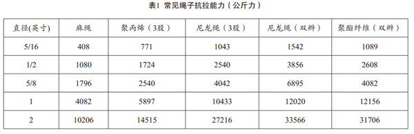 理想的圍油欄固定繩在拉力變化時長度不會改變。 在激流中布放圍油欄時, 選擇合適的固定繩非常重要。 聚丙烯繩會浮在水面, 這樣不容易受河床底部障礙物影響, 卻容易掛著水面的垃圾; 合成纖維繩比金屬繩容易操作; 只有在不需調整位置的時候, 才使用金屬繩。 凱夫拉爾纖維(Kevlar) 繩和斯百克(Spectra, 一種超高分子量聚乙烯纖維) 繩也可以使用, 但是需要在容易磨損的地方安裝保護套。 圍油欄布放的環(huán)境不同, 需根據具體情況選擇最合適的固定繩, 也要根據圍油欄受力情況選擇固定繩, 使繩子抗拉能力達到需要的抗拉能力的2-4倍, 常見的繩子抗拉能力見表1。