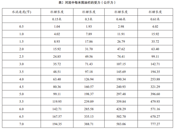 例如: 100米長圍油欄, 欄裙長0.46米, 水流速度為1節(jié)(1節(jié)=0.514米/秒) 。 此情況下, 圍油欄受力為: