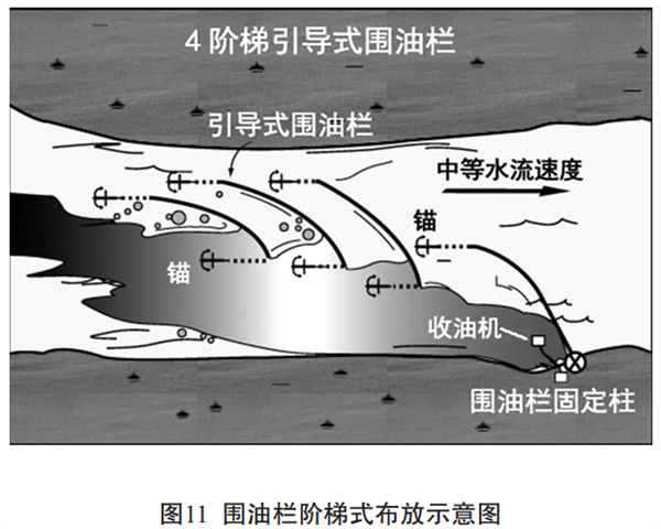 水流速度大于3節(jié)時圍油欄的布放當水流速度大于3節(jié)時, 雖然我們可以通過使圍油欄和水流方向成較大的角度, 來降低水流對圍油欄的沖擊力, 但圍油欄仍然承受巨大的拉力。 此時需要采取圍油欄階梯式布放, 減少拉力。 即: 使用多組短圍油欄來引導溢油, 使之流到可以回收的區(qū)域進行回收, 布放結構見圖11。