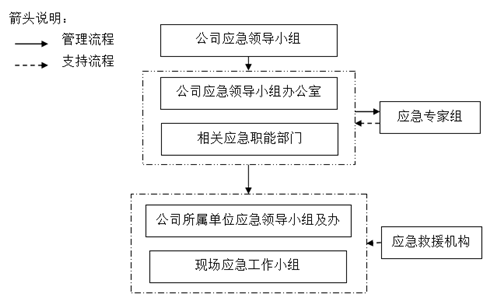符合以下條件之一時(shí),公司應(yīng)急領(lǐng)導(dǎo)小組將啟動(dòng)應(yīng)急響應(yīng)程序:發(fā)生Ⅰ、Ⅱ級(jí)突發(fā)事件;發(fā)生Ⅲ級(jí)突發(fā)事件,所屬單位請(qǐng)求給予支援或幫助;受所在國當(dāng)?shù)卣蛳嚓P(guān)方應(yīng)急聯(lián)動(dòng)要求。