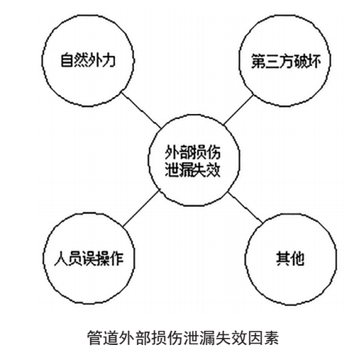 主要表現(xiàn)在三個(gè)方面:一是山體滑坡、塌方、雨水沖刷、河流改道、水土流失或黃土沉陷等自然外因造成管道錯(cuò)斷或破裂,多發(fā)生在雨天、季節(jié)變換時(shí)節(jié)。二是第三方破壞,在管道附近進(jìn)行取土、挖掘、基建等機(jī)械施工,以及不法分子打孔盜油,都會(huì)造成管道破裂泄漏。三是因崗位人員的技能素質(zhì)、應(yīng)變能力、責(zé)任心等差異導(dǎo)致的誤操作,也會(huì)引起管道運(yùn)行失控,甚至發(fā)生泄漏。這三個(gè)方面的原因造成的管道泄漏,均具有隨機(jī)性、不確定性、瞬時(shí)性特點(diǎn),屬管道外部失效因素,發(fā)生概率相對(duì)較小[1]。如下圖所示。