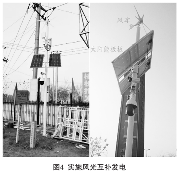 風(fēng)光互補(bǔ)系統(tǒng)每天最大提供電量大于等于1623WH,滿足系統(tǒng)用電需求的風(fēng)機(jī)日發(fā)電量330WH。現(xiàn)場(chǎng)安裝改造如圖4所示。