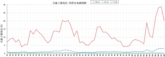 對管道與電氣化鐵路近距離并行的每個測試點(間隔1 km)均采用數(shù)據(jù)采集儀進行24 h交流干擾電壓連續(xù)檢測,統(tǒng)計交流干擾最大值、最小值及平均值數(shù)據(jù),并繪制了電壓-里程曲線圖,如圖2所示。