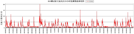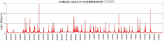 3處測試點24 h連續(xù)檢測得到的交流干擾電壓數(shù)據(jù)曲線見圖3、圖4、圖5。