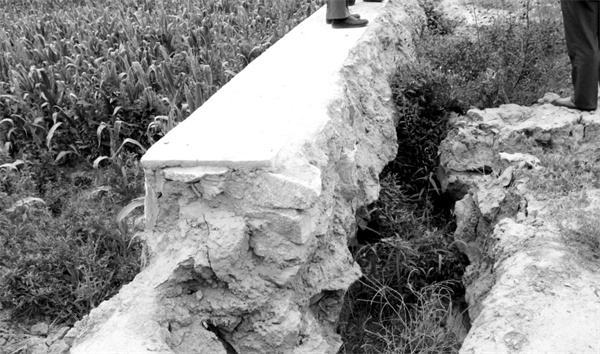 ①臨澤縣何強(qiáng)鎮(zhèn)蘭吉村西氣東輸二線管道,樁號BF034+156M處往西50m蘭小龍農(nóng)戶家的地,長20m左右護(hù)坡?lián)鯄?0m左右草袋護(hù)坡漏水,擋墻上兩塊地干旱,莊稼絕收;擋墻下地塊澇災(zāi)莊稼欠收,種植的臨澤小棗樹苗,因防護(hù)坡滲漏,全部死亡,約300m2土地荒蕪見圖1。