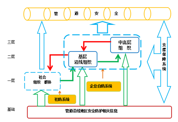 (4)企業(yè)自防系統(tǒng)。是企業(yè)自己建立的三層管理防護(hù)墻,即屬地三工(巡線工、維護(hù)工、看護(hù)工)、基層組織(維護(hù)站)、中高層組織(公司、管理處),它是管道信息處理、防范風(fēng)險(xiǎn)、現(xiàn)場(chǎng)處置的責(zé)任主體。負(fù)責(zé)信息收集、整合篩選、分析處理,并組織人員監(jiān)測(cè)和防護(hù)管道風(fēng)險(xiǎn),是責(zé)任主體。