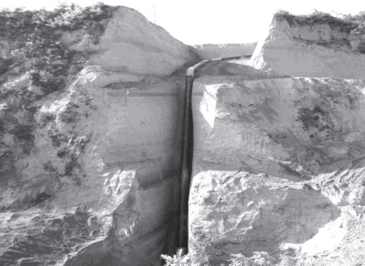 對西二線黃土塬地區(qū)多處大沖溝穿越段管道 進(jìn)行開挖驗證,均發(fā)現(xiàn)管底出現(xiàn)不同程度的懸空現(xiàn) 象,懸空高度局部可達(dá)2m,懸空暴露處長度已經(jīng) 達(dá)到10m左右。如果管底空穴進(jìn)一步擴(kuò)大,達(dá)到管 道懸空最大限度后,管道將承受上方覆土造成的垂 直應(yīng)力作用,威脅管道安全。