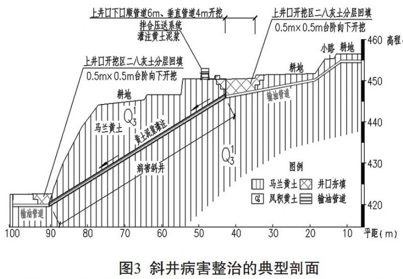 由于受黃土地區(qū)水文、 地質和施工工藝等諸多因素的影響, 管道沿線的斜井工程不同程度的出現(xiàn)了病害, 可能導致管體發(fā)生彎曲或管體局部應力集中發(fā)生疲勞受損, 甚至可能發(fā)生斜井所在邊坡失穩(wěn), 嚴重威脅到輸油管道的安全營運。