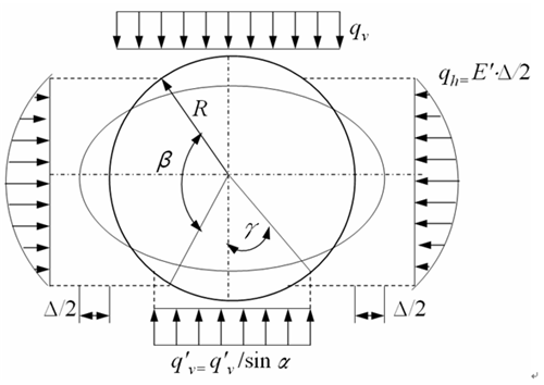 Spangler-Iowa方法管道示意如圖 2所示,作用于管頂?shù)拇怪陛d荷按均布載荷考慮,其分布寬度與管道外徑相同。管底承受地基垂直反力,均勻作用于圓心角2γ,管側(cè)承受土壤彈性抗力,其強度為二次拋物線規(guī)律分布,作用范圍對應(yīng)圓心角β,最大抗力qh位于水平直徑的兩端。