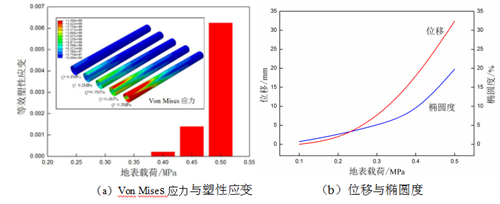圖4(b)中,隨著地表載荷增大,管道沉降量逐漸增大。當(dāng)?shù)乇磔d荷小于0.2 MPa時,管道最大沉降量僅為1.3 mm。管道最危險截面橢圓度隨著地表載荷的增大而增大,當(dāng)?shù)乇磔d荷小于0.4 MPa時,管道僅發(fā)生彈性變形,且橢圓度變化率非常小。當(dāng)進入非彈性階段后,管道橢圓度較大且出現(xiàn)塑性變形。此時,管道承載能力急劇降低,不利于清管工作,且易出現(xiàn)裂紋[7]。