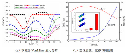 圖5(b)中,當(dāng)徑厚比為60時,管道未出現(xiàn)塑性變形。隨著徑厚比增大,管道的塑性應(yīng)變和塑性變形區(qū)域均增大。塑性變形區(qū)最先出現(xiàn)在管道頂部,隨著徑厚比增大,管道兩側(cè)也逐漸進入塑性區(qū)。對于薄壁管道,地表堆載作用下易出現(xiàn)凹陷,截面呈新月形。隨著徑厚比增大,管道沉降量先增大后減小,管道臨界徑厚比為60;當(dāng)徑厚比小于60時,管道處于彈性變形階段,地表堆載作用下管道彎曲應(yīng)變非常小,管道沉降量隨著徑厚比增加而增加;當(dāng)徑厚比大于60時,管道進入塑性階段,薄壁管道吸收了較多附加能量,因而,管道沉降量隨著徑厚比增大而減小。管道截面橢圓度隨著徑厚比增大而增大,且其變化率也逐漸增大。