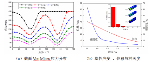 圖6(b)所示管道最大等效塑性應(yīng)變隨著埋深的增加而減小。當(dāng)埋深大于1.5 m時,管道未出現(xiàn)塑性變形;而當(dāng)埋深小于0.5 m時,管道變形非常嚴重,出現(xiàn)了較大凹陷區(qū)域。管道沉降量隨埋深的增加而減小,當(dāng)埋深為3.0 m時,沉降量僅為7.83 mm。管道截面橢圓度也隨著埋深的增加而減小,且變化率也逐漸減小。當(dāng)埋深為1.5 m時,管道橢圓度為9.6%。在彈性變形階段,管道橢圓度變化率非常小。因而,增加埋深是降低地表堆載影響的有效途徑之一。