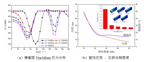圖7(b)中,管道最大等效塑性應(yīng)變隨著圍土彈性模量增加而減小。當(dāng)E≥20 MPa時,管道塑性應(yīng)變變化率非常小,且塑性應(yīng)變分布較為接近。但當(dāng)E=10 MPa時,管道卻出現(xiàn)了較為嚴重塑性區(qū),因而,在敷設(shè)管道回填時,需要嚴格關(guān)注回填土的選擇。埋地管道的沉降量和截面橢圓度均隨圍土彈性模量的增加而減小,但其變化率也逐漸減小。
