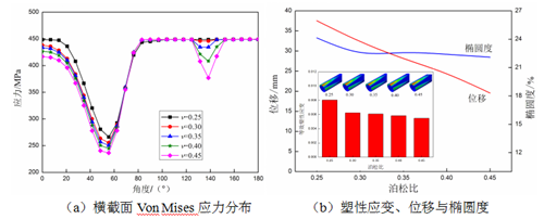 圖8 不同圍土泊松比下埋地管道應(yīng)力應(yīng)變響應(yīng)