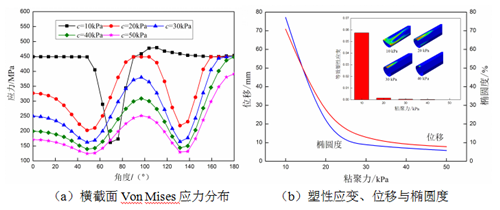 (3)管道應(yīng)力、等效塑性應(yīng)變、沉降量和截面橢圓度均隨圍土黏聚力、泊松比、彈性模量的增大而減小。