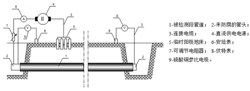 為保證回拖管道今后的安全運(yùn)行,需對穿越管段的防腐層完整性進(jìn)行評估。評估方法是根據(jù)測試埋地管道的電阻(圖2),推算出涂層缺陷處的直徑當(dāng)量,從而得出防腐層破損率,最后根據(jù)防腐層破損情況在兩岸設(shè)置適當(dāng)數(shù)量的犧牲陽極,以確保管道不被腐蝕。
