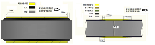 通過吸收國外先進(jìn)技術(shù)及經(jīng)驗(yàn),結(jié)合國內(nèi)3LPE外防腐層應(yīng)用情況,研究開發(fā)了外防腐層的防護(hù)材料,即由高強(qiáng)度纖維增強(qiáng)材料和高性能環(huán)氧粘膠組成的改性環(huán)氧玻璃鋼。可在3LPE預(yù)制廠或定向鉆工程現(xiàn)場纏繞涂覆于3LPE管體防腐層外部,固化后與3LPE防腐層牢固粘接為整體結(jié)構(gòu),使穿越段管道形成“防護(hù)層+3LPE層”雙層結(jié)構(gòu),為HDD管道外防腐層提供優(yōu)異的機(jī)械防護(hù),可在HDD管道防腐層外部全段、外部局部和補(bǔ)口部位使用(見圖 8)。