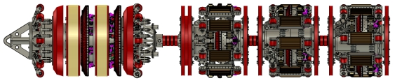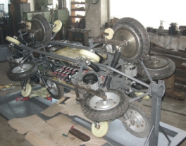 依托伊霍線等新建管道工程研制的自源主動(dòng)運(yùn)動(dòng)智能牽引系統(tǒng),成功解決了內(nèi)檢測(cè)器的動(dòng)力源問(wèn)題。該自源主動(dòng)運(yùn)行智能牽引系統(tǒng)由輪式管道行走動(dòng)力機(jī)械結(jié)構(gòu)和自動(dòng)控制系統(tǒng)組成,其中輪式管道行走動(dòng)力機(jī)械結(jié)構(gòu)由超輕車(chē)身、八輪行進(jìn)結(jié)構(gòu)、燃油系統(tǒng)支撐結(jié)構(gòu)、電機(jī)電瓶系統(tǒng)支撐結(jié)構(gòu)等組成,自動(dòng)控制系統(tǒng)由汽油發(fā)電機(jī)控制系統(tǒng)、速度控制系統(tǒng)和供電監(jiān)測(cè)系統(tǒng)等組成。依托于該自源主動(dòng)運(yùn)行智能牽引系統(tǒng),成功開(kāi)展了牽引力試驗(yàn)、爬坡能力試驗(yàn)(下坡速度控制在1.2 m/s以下)、彎頭能力試驗(yàn)和工作壽命試驗(yàn)等,實(shí)現(xiàn)了我國(guó)首次空管變徑、弱磁內(nèi)檢測(cè)。