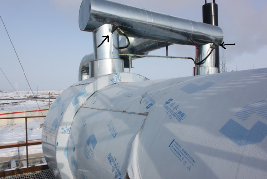 (3)備用相變爐在長時間停運的情況下,相變爐蒸汽發(fā)生器里面的軟化水溫度就會下降,由于蒸汽發(fā)生器液位計管線沒有保溫措施,冬季可能會被凍裂,形成安全隱患。如圖3所示。