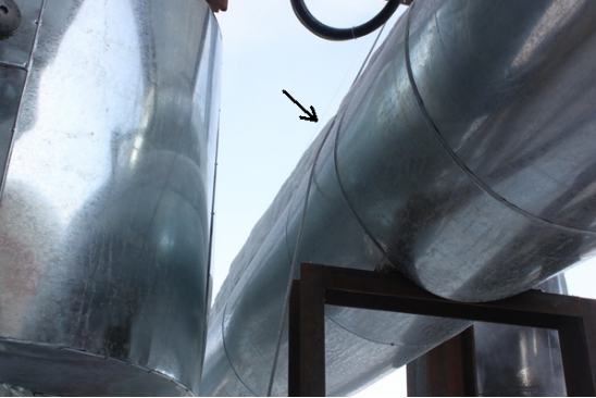 ②用于固定相變爐蒸汽發(fā)生器煙囪的部分鋼絲蹦繩緊貼在原油管線上,若煙囪遇到雷擊,強大的電流會順著蹦繩進(jìn)入到管線內(nèi),存在發(fā)生火災(zāi)、爆炸、設(shè)備損壞及操作人員被雷擊、等風(fēng)險。如圖6所示。