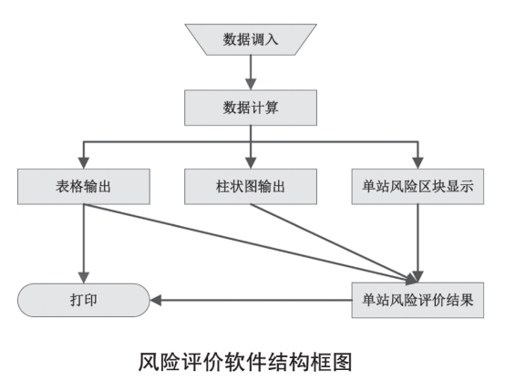 在基于模糊失效概率等級的站場風(fēng)險評價模型理論研究的基礎(chǔ)上研制了站場風(fēng)險評價軟件系統(tǒng),方便對各種信息參數(shù)的管理和綜合利用,提高了站場風(fēng)險評價的工作效率,充分識別站場的各項風(fēng)險。軟件的結(jié)構(gòu)模塊如下圖所示,“數(shù)據(jù)調(diào)入”用于完成數(shù)據(jù)的輸入。“數(shù)據(jù)計算”按輸氣站場風(fēng)險評價的計算法則完成各種參數(shù)的計算。“表格輸出”是將計算所得的結(jié)果數(shù)據(jù)以數(shù)據(jù)表的方式顯示、排序。“柱狀圖輸出”是以柱狀圖的方式顯示計算結(jié)果。“工藝流程示意圖”是該軟件中特有的,以站場的區(qū)塊為背景,直觀、形象地顯示所評價的站場及站場上各個區(qū)塊的風(fēng)險狀況。“單個輸氣站場風(fēng)險評價結(jié)果”為該軟件的最后一個輸出模塊,它能夠詳細(xì)地顯示被評價站場的基本信息、風(fēng)險評價結(jié)果、威脅該站場的主要因素以及相應(yīng)的風(fēng)險緩解建議措施。“打印”能夠?qū)崿F(xiàn)該軟件評價結(jié)果的預(yù)覽和輸出打印。