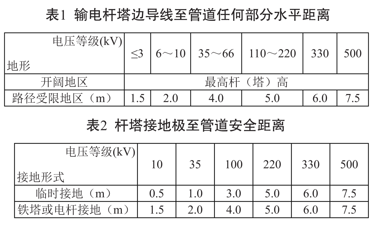 50698)從交流干擾腐蝕防護(hù)的角度,對埋地管道與高壓輸電線路的距離進(jìn)行了規(guī)定:在開闊地區(qū),與桿塔基礎(chǔ)最小距離不小于最高塔桿高度;在路徑受限地區(qū),與塔桿邊導(dǎo)線及接地裝置的最小水平距離符合表1、表2規(guī)定。