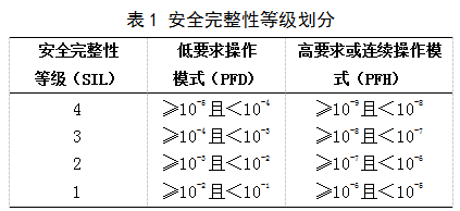 為了使安全相關(guān)系統(tǒng)達(dá)到相應(yīng)的要求,需用安全完整性等級(jí)(Safety Integrity Level,SIL)來(lái)衡量系統(tǒng)實(shí)現(xiàn)風(fēng)險(xiǎn)降低的能力。IEC61508中將SIL劃分為4級(jí),SIL1表示能將風(fēng)險(xiǎn)降低1級(jí),即使系統(tǒng)出現(xiàn)事故的概率降低為原來(lái)的十分之一;SIL4表示能將風(fēng)險(xiǎn)降低4級(jí),也就是說(shuō)使系統(tǒng)發(fā)生事故的概率降低為原來(lái)的萬(wàn)分之一。安全完整性等級(jí)的級(jí)別越高,系統(tǒng)的結(jié)構(gòu)就越復(fù)雜,相應(yīng)出錯(cuò)的概率也就越低[1-2]。具體的安全完整性等級(jí)劃分見(jiàn)表1。