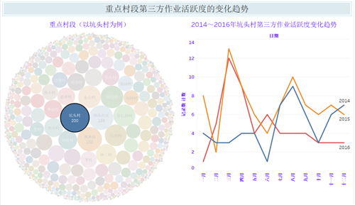 由于村/社區(qū)、鎮(zhèn)/街辦、區(qū)和市之間具有行政隸屬關(guān)系,我們可以利用該變量的分層鉆取功能,快速地在同一儀表盤(pán)中展現(xiàn)市、區(qū)、鎮(zhèn)/街辦等轄區(qū)內(nèi)的施工活動(dòng)活躍程度,讓各區(qū)、各責(zé)任段的管道保護(hù)人員從中發(fā)現(xiàn)能指導(dǎo)自己工作的有價(jià)值的信息。從圖1可以看出,廣佛區(qū)的坑頭村、廟頭社區(qū)、里仁洞村、樟邊村、海傍村、金山村、鐘三村,東莞區(qū)的溫塘村,惠州區(qū)的黃漁涌村、南坑村內(nèi)近三年施工活動(dòng)活躍度很高;而其中的坑頭村,2015年為近三年中活躍度最高的年份,盡管各年逐月變化的趨勢(shì)不盡相同,但每年的3月、4月及8月、9月份基本達(dá)到當(dāng)年峰值,呈現(xiàn)出明顯的活躍期。圖1及圖2的可視化及分析結(jié)果,有助于管道安防人員通過(guò)增加相應(yīng)時(shí)段的管道巡查頻率、加強(qiáng)管道保護(hù)宣傳和外事協(xié)調(diào)來(lái)預(yù)警和管控施工活動(dòng)違規(guī)行為。