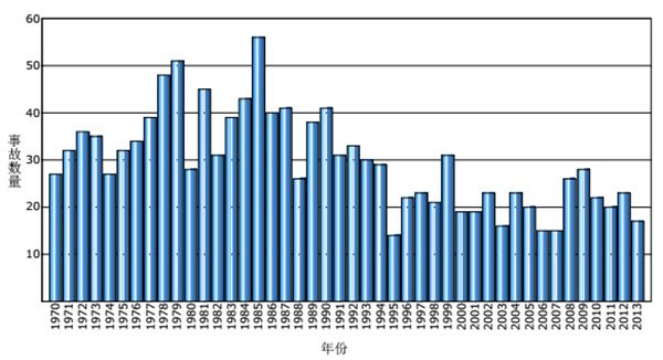 圖20 整體和5年移動(dòng)平均失效頻率(1962-2014年)