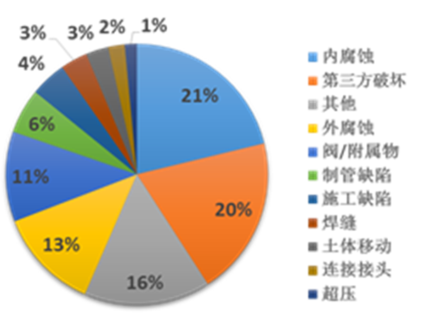 原油、天然氣管道失效原因按比例高低均分別為:內(nèi)腐蝕、第三方破壞和外腐蝕(圖17、18)。