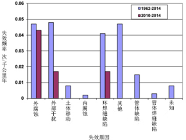 主要失效原因包括外腐蝕、外部干擾和環(huán)焊縫缺陷。管體缺陷和制管焊縫缺陷導(dǎo)致的失效在近5年(2010-2014年)沒(méi)有發(fā)生(圖21),這與制管水平的提高有較大關(guān)聯(lián)。