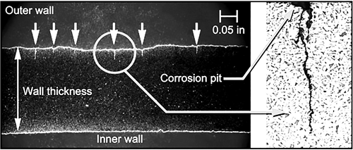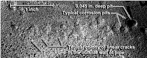 管體表面可以見到腐蝕坑,通過磁粉探傷可以觀察到管道外壁細小的線性裂紋。