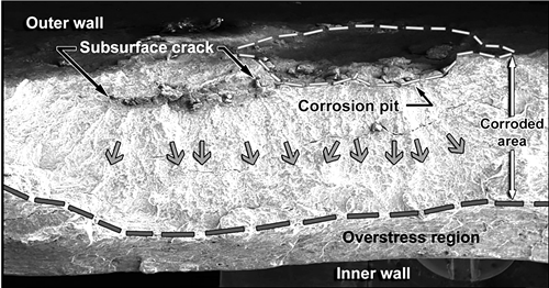管道破裂點位于直焊縫附近,裂紋由腐蝕坑底部發(fā)展,下圖為事件管段電子顯微鏡圖片。
