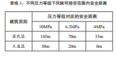 從圖中可以看出,隨著設(shè)計(jì)壓力等級(jí)降低,人員死亡風(fēng)險(xiǎn)明顯減小,依據(jù)風(fēng)險(xiǎn)可接受標(biāo)準(zhǔn),不同設(shè)計(jì)壓力下風(fēng)險(xiǎn)可接受范圍內(nèi)的安全距離如表格3所示。
