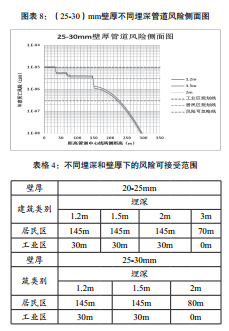基于此分析,可以確定在10MPa運(yùn)行壓力不同壁厚和不同埋深下的安全距離,見(jiàn)表格4所示。
