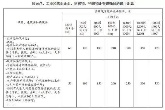 該標準規(guī)定了居民點、工業(yè)(農業(yè))企業(yè)、建筑物、構筑物距干線輸氣管道的最小距離(見下表)。其中屬于人口密集的火車站、汽車站、機場、學校、醫(yī)院、會所等(相當于我國標準規(guī)定的4級地區(qū))距干線管道的距離,按照管道直徑150—1400毫米等7個檔次,規(guī)定最小距離為60米,最大距離為420米。城市和居民點、3層及3層以上住宅距干線管道的距離,按照管道直徑150—1400毫米等7個檔次,規(guī)定最小距離為50米,最大距離為350米。