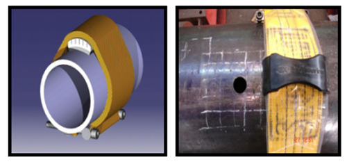 北京華油國際物流工程服務(wù)有限公司在凱夫拉纖維的基礎(chǔ)上,自主研發(fā)了油氣管道柔性帶壓快速堵漏套具(如圖4所示)。該套具可以對(duì)不同管徑直管段、彎頭、焊縫、變徑等部位的泄漏進(jìn)行應(yīng)急堵漏,適用于直徑小于50毫米、壓力不大于10MPa的泄漏。其最大的特點(diǎn)是,可以實(shí)現(xiàn)在帶壓工況下快速完成對(duì)管道泄漏部位的封堵。該產(chǎn)品已經(jīng)中石油管道應(yīng)急搶險(xiǎn)中心、西部管道公司、西氣東輸公司、中海油工程服務(wù)有限公司等多家單位現(xiàn)場試驗(yàn),堵漏效果良好。