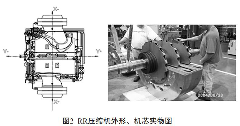 機(jī)殼為鑄造機(jī)殼,在機(jī)殼內(nèi)鑄造有進(jìn)氣室和排氣室,分別與進(jìn)排氣法蘭連通,不需要在機(jī)芯上制作蝸殼,如圖2所示。壓縮機(jī)的進(jìn)出口法蘭中心線在同一條直線上,且都采用了36吋的接口。因此, RR壓縮機(jī)的機(jī)殼是統(tǒng)一的,機(jī)芯改型較為方便。