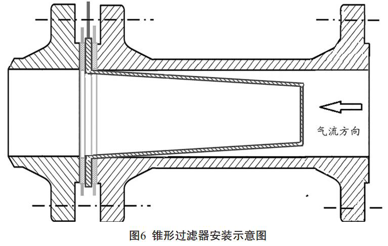 錐形過(guò)濾器安裝在壓縮機(jī)入口兩個(gè)法蘭片之間,使用兩個(gè)金屬纏繞墊片,如圖6所示。由于拆卸后法蘭之間的間隙增大,拆卸、安裝可能對(duì)壓縮機(jī)對(duì)中造成影響,擔(dān)心雜質(zhì)進(jìn)入損壞壓縮機(jī),所以管道企業(yè)一般在壓縮機(jī)組投產(chǎn)后都不進(jìn)行拆除。但是,這個(gè)錐形過(guò)濾器畢竟只是一個(gè)臨時(shí)過(guò)濾器,曾經(jīng)出現(xiàn)過(guò)過(guò)濾器損壞造成壓縮機(jī)振動(dòng)的問(wèn)題。雖然已在壓縮機(jī)組的招標(biāo)技術(shù)規(guī)格書(shū)中要求將該過(guò)濾器改為永久安裝形式,但廠家也可能不予采納。