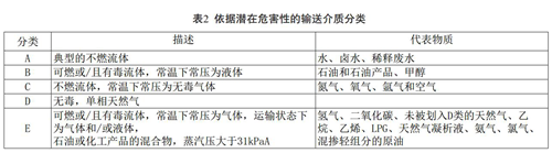 5.2 節(jié)規(guī)定應(yīng)將輸送介質(zhì)按照表2進(jìn)行分類。