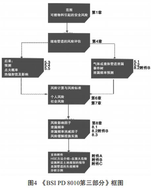 《 BSI PD 8010第三部分》提供風(fēng)險(xiǎn)評(píng)估導(dǎo)則的輸送可燃介質(zhì)管道,也是《管道安全法》規(guī)定需要開展安全分析的重大危害管道,但并沒(méi)有包括輸送有毒介質(zhì)的管道。第三部分內(nèi)容框圖如圖4所示。