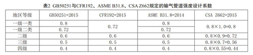 劃分地區(qū)等級的目的是區(qū)分管道強度設(shè)計系數(shù),管道強度設(shè)計系數(shù)與地區(qū)等級配套使用,最早用于輸氣管道設(shè)計,后來也被高蒸汽壓液體管道所采用。GB50251-2015規(guī)定的強度設(shè)計系數(shù)主要參考了ASME B31.8,增加了一級一類地區(qū)和一級二類地區(qū),引入了0.8的設(shè)計系數(shù)。但值得注意的是,美國聯(lián)邦法規(guī) 49CFR 192至今未采納0.8的強度設(shè)計系數(shù),允許的最大強度設(shè)計系數(shù)為0.72。 CSA Z662規(guī)定計算管道設(shè)計壓力的設(shè)計系數(shù)為F×L,設(shè)計系數(shù)( F)取值為0.8, L為地區(qū)等級系數(shù),對于非酸性天然氣管道,地區(qū)等級系數(shù)( L)取值為:一級地區(qū)為1、二級地區(qū)為0.9、三級地區(qū)為0.7、四級地區(qū)為0.55。一般地段的輸氣管道的設(shè)計系數(shù)規(guī)定匯總見表2。由表2看出, CSA Z662的設(shè)計系數(shù)明顯高于其他標準。