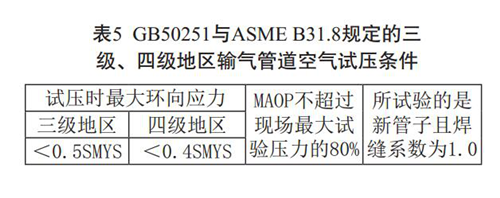 注3: GB50251和ASME B31.8規(guī)定了在三級、四級地區(qū)使用空氣作為試壓介質(zhì)的條件,具體見表5。