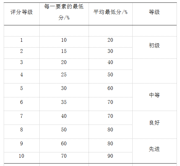 為了更加清晰地掌握企業(yè)完整性管理實施狀態(tài),直觀了解完整性管理水平所處的等級,明確完整性管理努力的方向,根據(jù)調(diào)查體系中各要素的平均得分率以及各子程序最低得分率情況,將完整性管理水平分為初級、中等、良好、先進四個大范圍等級,這四個等級又可以細分出10個小范圍等級,如表2所示。