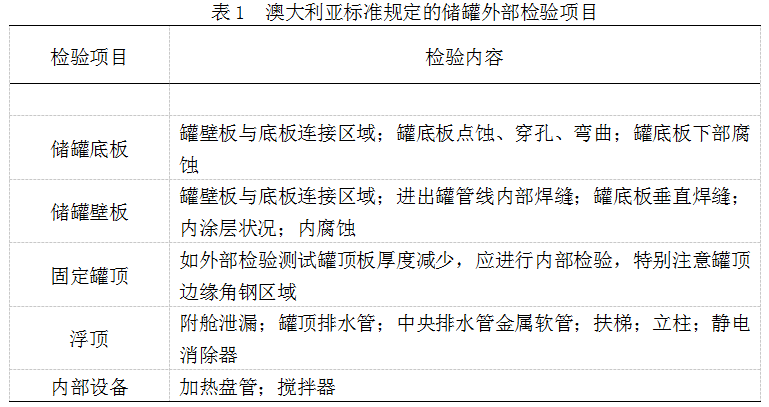 該標準規(guī)定儲罐應(yīng)優(yōu)先進行外部檢驗,根據(jù)外觀檢驗結(jié)果確定是否維修,以及是否進行內(nèi)部檢驗,外部檢驗項目見表1。