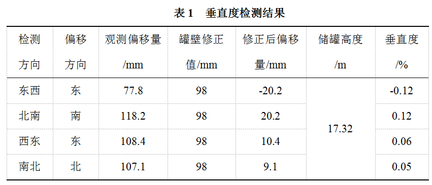 2017年8月24日進(jìn)行了垂直度檢測,利用MS05型全站儀自由設(shè)站測量罐體同一垂線頂部及底部的水平距離,觀測方向為東西、北南、西北、南北四個方向。以測量儲罐頂部和底部的距離計算罐體頂部檢測點(diǎn)相對于罐體底部檢測點(diǎn)的傾斜方向,結(jié)果見表1。檢測結(jié)果符合《油罐的檢驗、修理、改建及翻建》(SY/T 6620―2014) 10.5.2.1 “罐壁頂部相對于罐壁底部的不垂直度不應(yīng)超過油罐總高度的1%,但最大為127mm”。